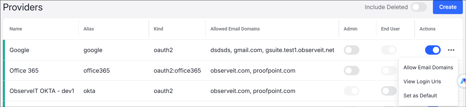 Providers area, all the IdP providers available for the tenant are listed. By default, the IdP is enabled for the Administrator.