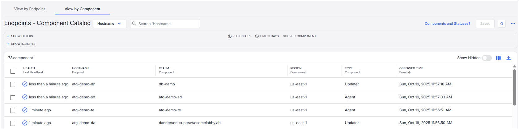 View by Component: The clients installed on the endpoint. This can be the Agent or the Updater. The Component view shows the health status (Last Heartbeat).