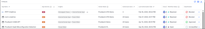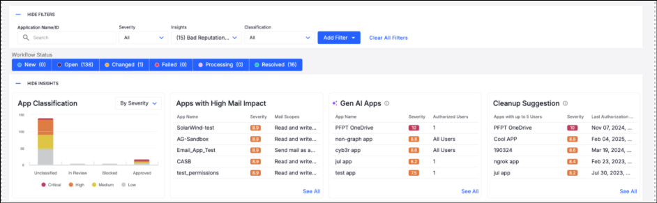 App Classification Status: Shows how many apps are unclassified, in review, blocked, or approved. Organizations should aim to review all apps - and at minimum, prioritize those with high severity - and classify them as either Approved or Blocked to strengthen governance and reduce risk.