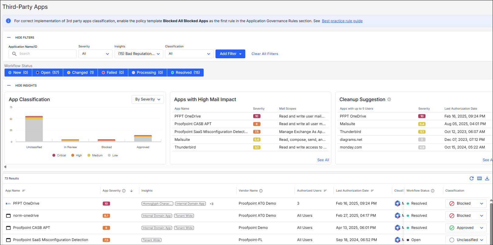 Enabling the policy template ‘Block All Blocked Apps’ as the first rule in the Application Governance rules section is mandatory for correct implementation of 3rd party apps classification.