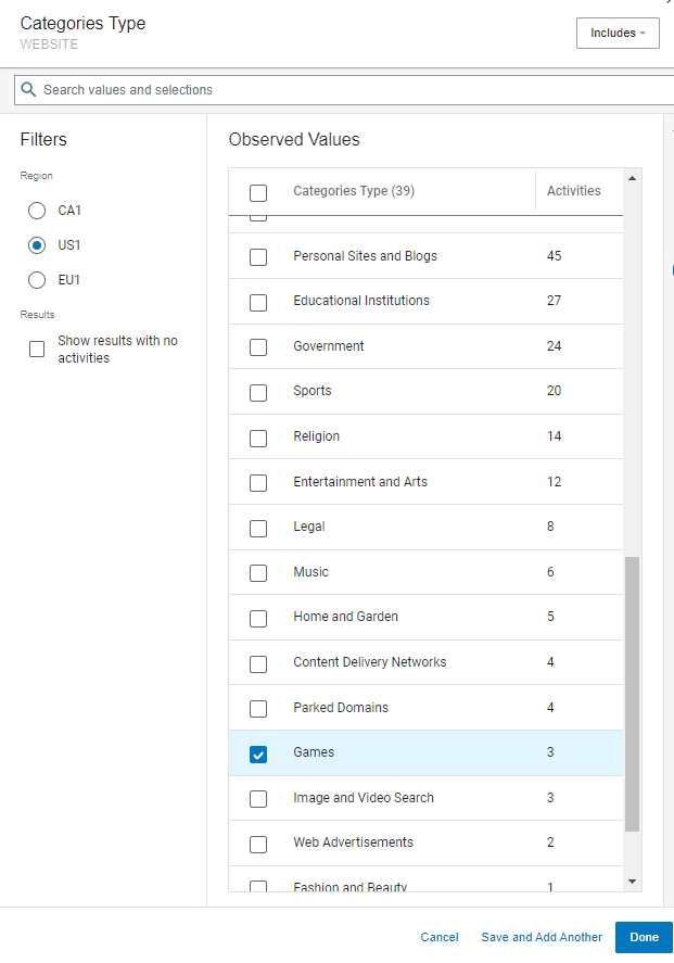 You can set up a rule that detects and alerts on a specific category. Use the In operator as shown in the example below, where an alert is triggered when users browse Games sites.