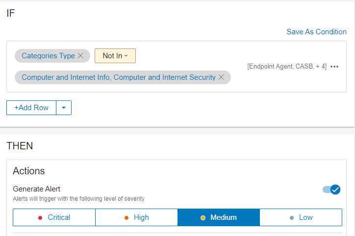 You can also use the Not In operator to detect all browsing except for the categories you specify. In the example, alerts are generated for any browsing except Computer and Internet Information and Computer and Internet Security.
