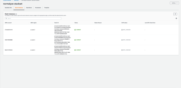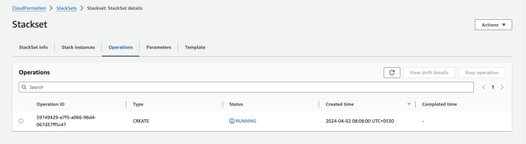 The Stack creation operation status is shown on the Operations tab. The respective account level details are shown on the Stack Instances tab.