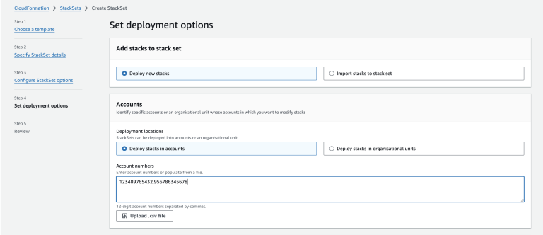 The list of child accounts to be onboarded can be set in the Accounts section by selecting Deploy stacks to accounts. In the Account numbers section, upload a CSV file containing the Account IDs or enter the Account IDs using CSV format.