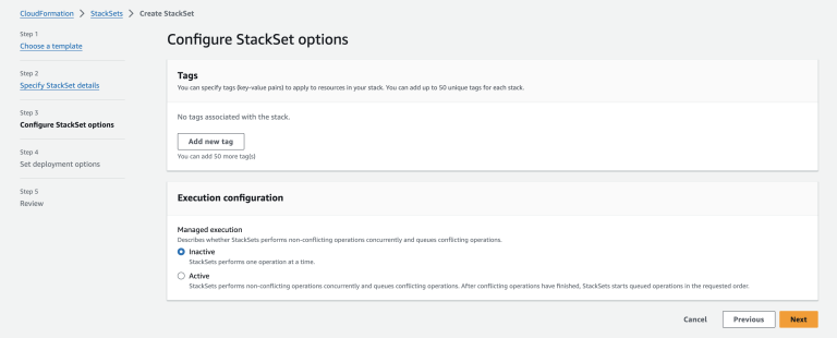 Tags is an optional setting, if there is a requirement to add that as per the cloud policy then it can be set accordingly. In the Execution configuration section, select Inactive. Select Next.