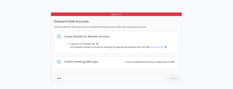 - The Onboard Child Accounts section shows the details for creating the Stackset on the child accounts linked to the Organization account.