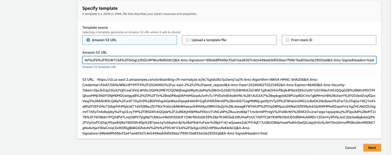 Scroll down to the Specify template section and paste the url you copied in the previous step under Amazon S3 URL. Select Next.