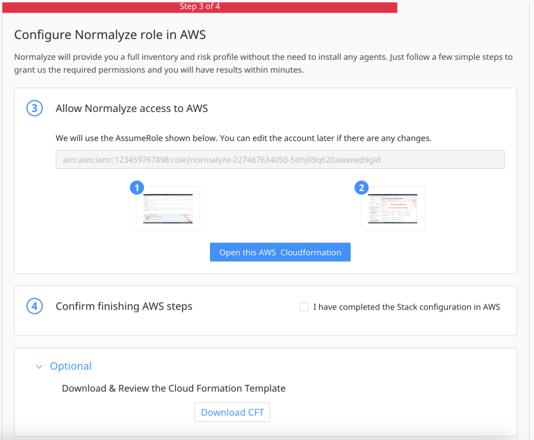 - In the Allow Normalyze access to AWS section, select Open this AWS CloudFormation. This opens the AWS console in a new browser tab.