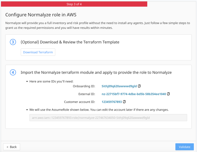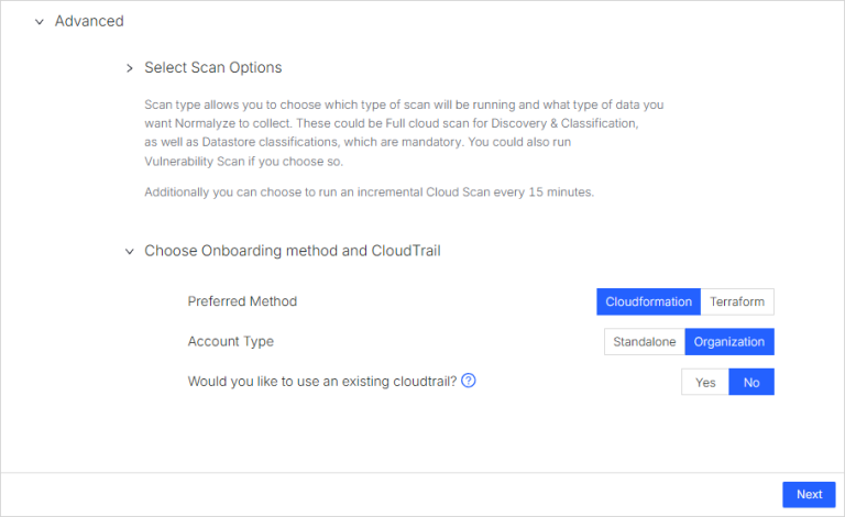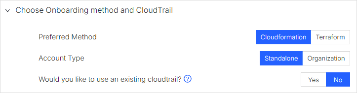 Based on your preferred onboarding method, you will either go through the CloudFormation or Terraform deployment screen.