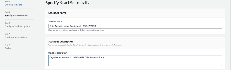 Provide the StackSet name and description. This will be the name for the stack that will be deployed on each of the child accounts. Select Next.