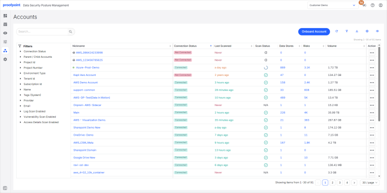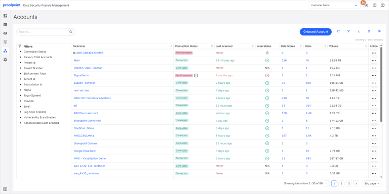 This capability of AWS is leveraged by DSPM for onboarding, where in all the child accounts that are linked to a parent need not be onboarded individually but can be done so in one operation. The functionality allows to pick and choose which of the accounts linked to the parent account should be onboarded or not there by giving a flexible means for the administrators to decide.