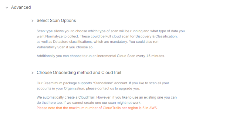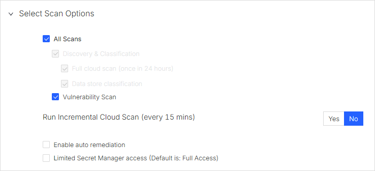 If enabled, this option will run the cloud scan every 15 minutes in ‘incremental’ fashion to discover newly added and modified data stores and assets. Any deleted or removed data stores are also identified and updated.