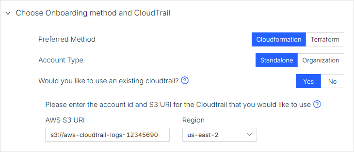 Expand Choose Onboarding method and CloudTrail to configure additional onboarding settings.