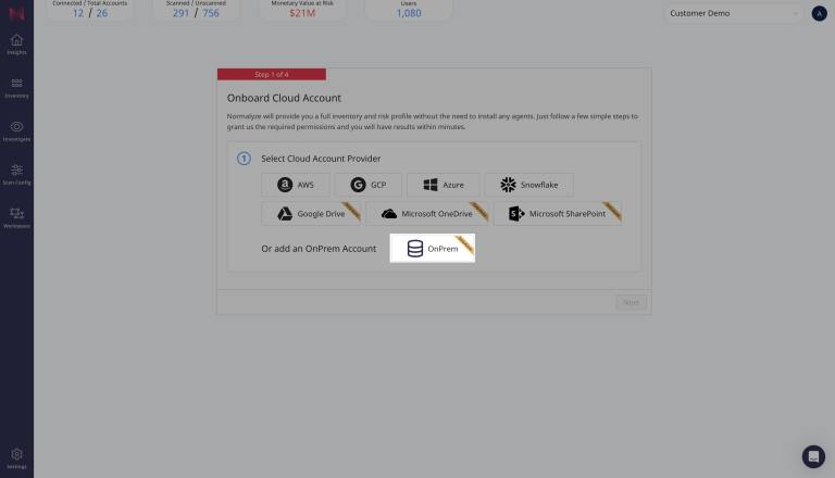 - Then select Onprem Datastores as the type of data store to scan