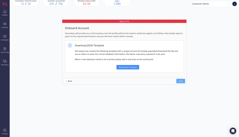 Select the blue button to download the Scan Target Configuration template in JSON to your computer, then select Next