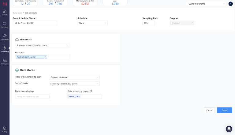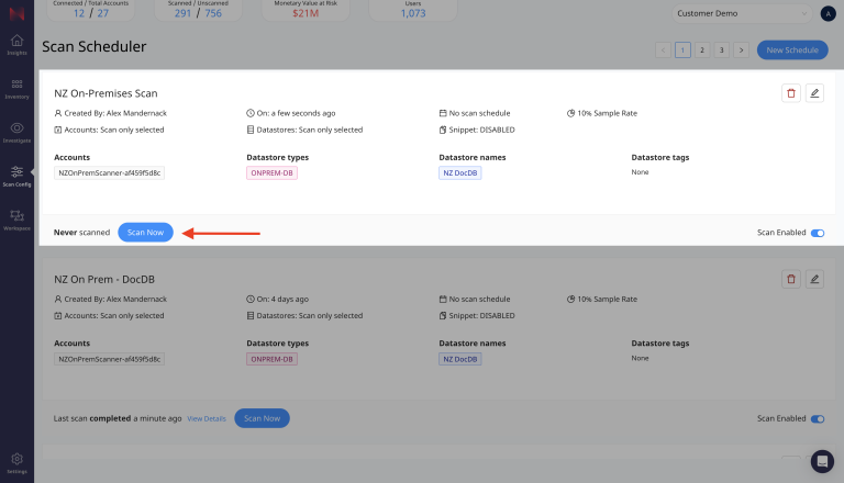 Navigate to the Scan Scheduler page again, find the scan profile that you just created and select Scan Now. This will immediately start a data scan on the on-premises data store that you have specified.