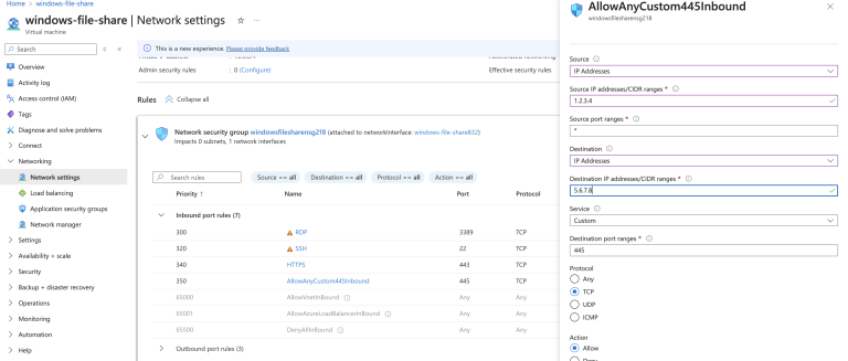 The below screenshot shows an example for the Rule created for Azure VM that is hosting the Windows fileshare.