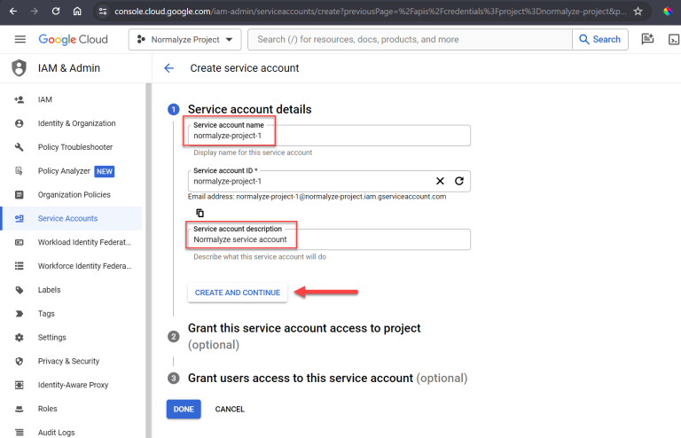 Fill in the Service account name and optional Service account description, then select CREATE AND CONTINUE
