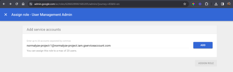 Enter the Service Account email created in Create Service Account section earlier then select ADD.