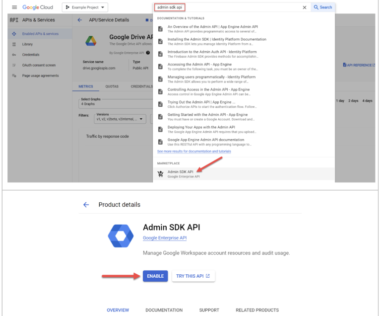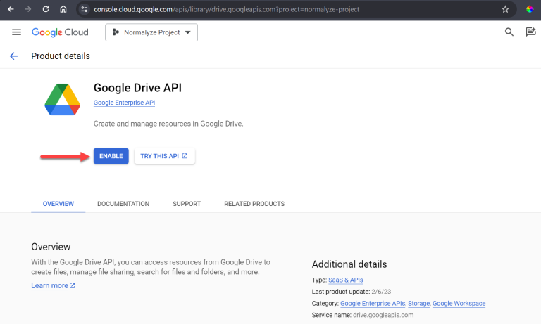 Select ENABLE for the Google Drive API