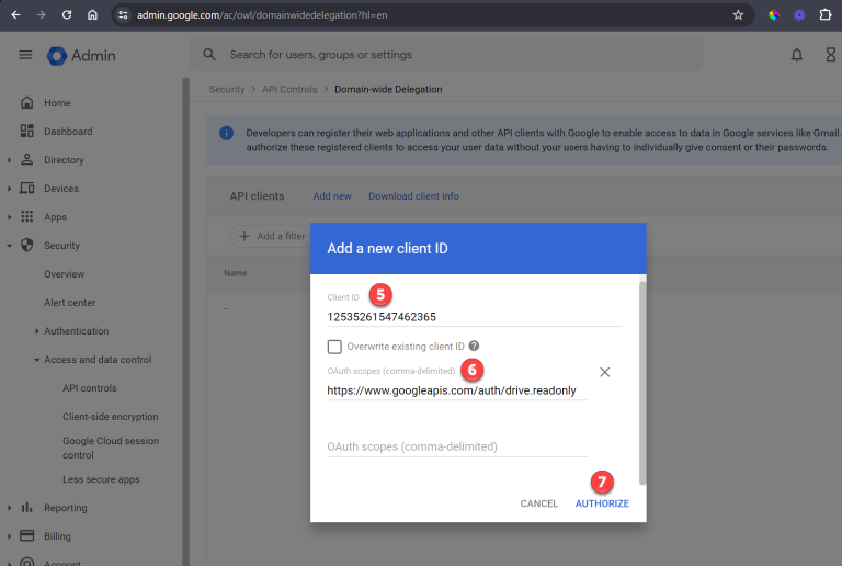 - Enter the Service Account Client ID created in the previous step on the Client ID line