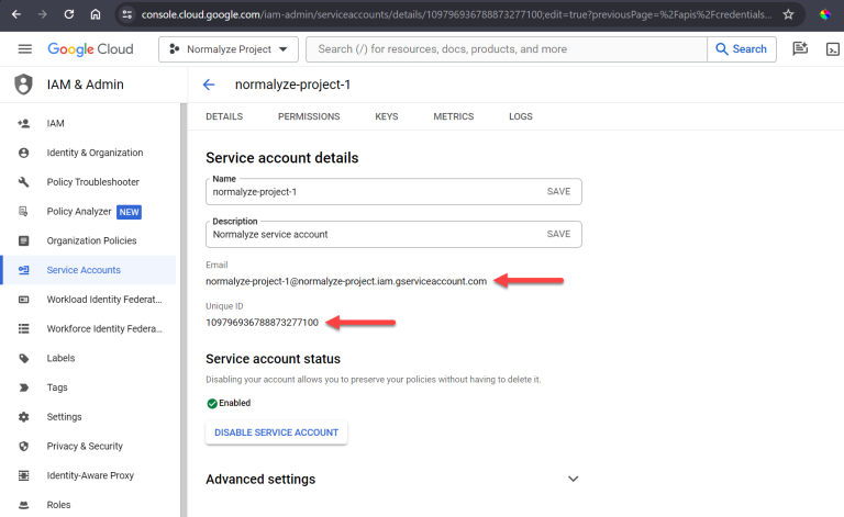 - On the updated Credentials screen, select the email link for the new service account to view the details