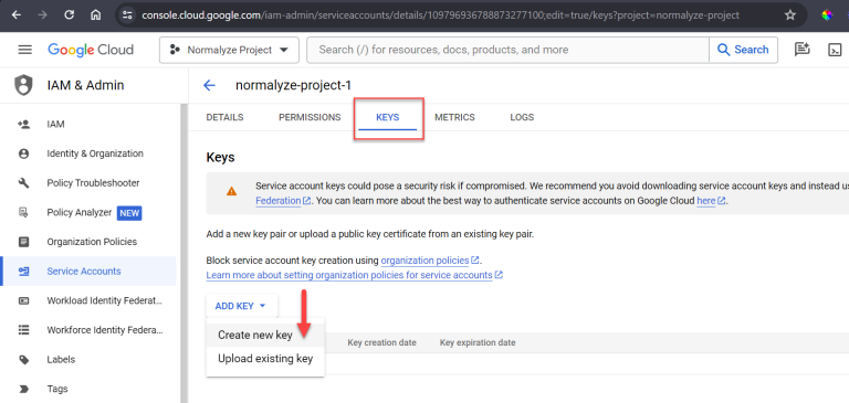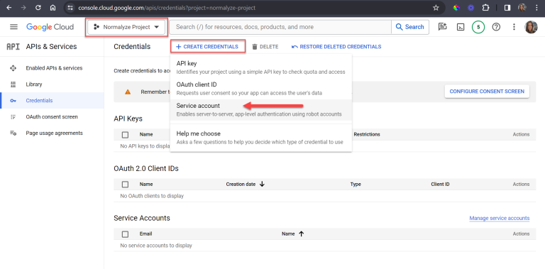 Select CREATE CREDENTIALS at the top of the screen, then Service account from the options shown
