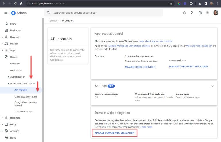 - Under Domain Wide Delegation -> MANAGE DOMAIN WIDE DELEGATION
