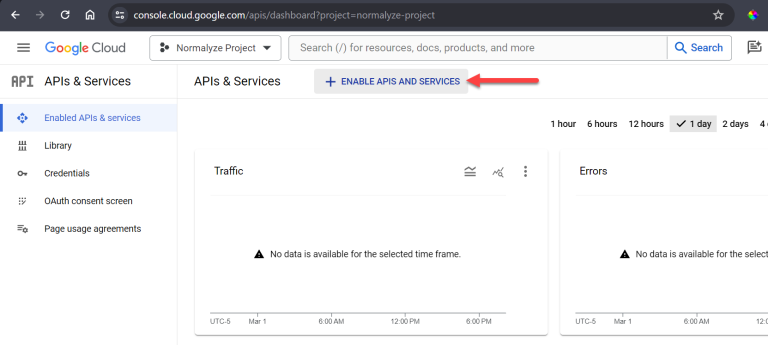 Select ENABLE APIS AND SERVICES from the top panel to find the specific APIs that need to be enabled