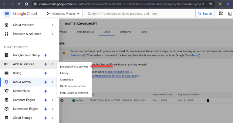 Back in console.cloud.google.com, from the left side menu select APIs and Services and then Enabled APIs and services