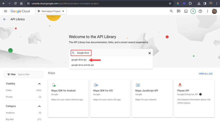 Search for Google Drive and select google drive api from the results