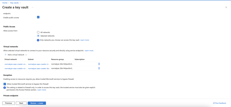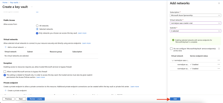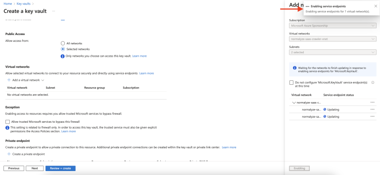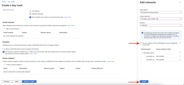 Do not select the option “Do not configure ‘Microsoft.KeyVault’ service endpoint(s) at this time” and select “Enable”.