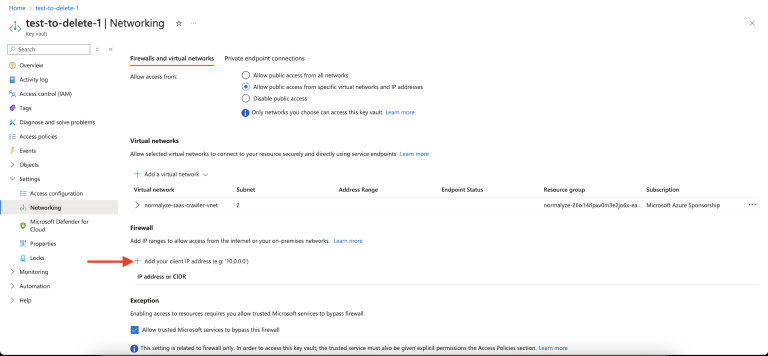 In the field under IP Address or CIDR, add the list of IP’s / CIDR that would be allowed to access the Key Vault in addition to the subnets added in the earlier steps.