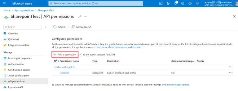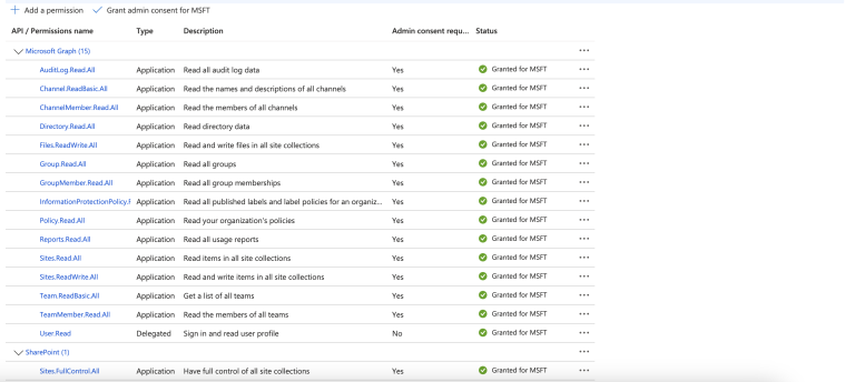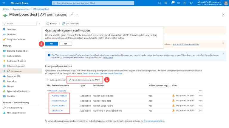 - Select Grant admin consent for MSFT. Select Yes in the pop up box to confirm.