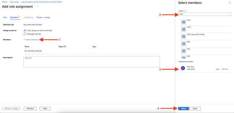 Under Members, click on “Select members” (marked 1 in the screenshot) and add the requisite user (same user who created the Key Vault) by selecting (marked 2 and 3 in the screenshot) and clicking Select (marked 4 in the screenshot) at the bottom.
