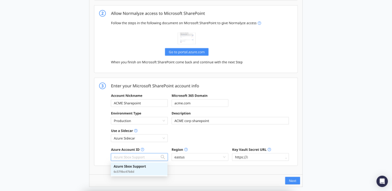 - Azure Account ID: from the drop-down select the Azure account where the steps for Azure sidecar are configured.
