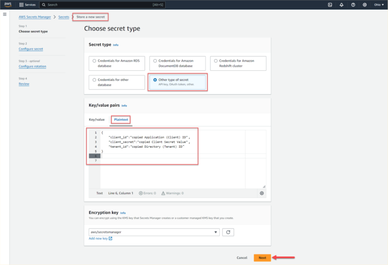 Secret Value - Input the value which was saved in step 3 under pre-requisites section.Copy the entire value including the braces and input it in this field