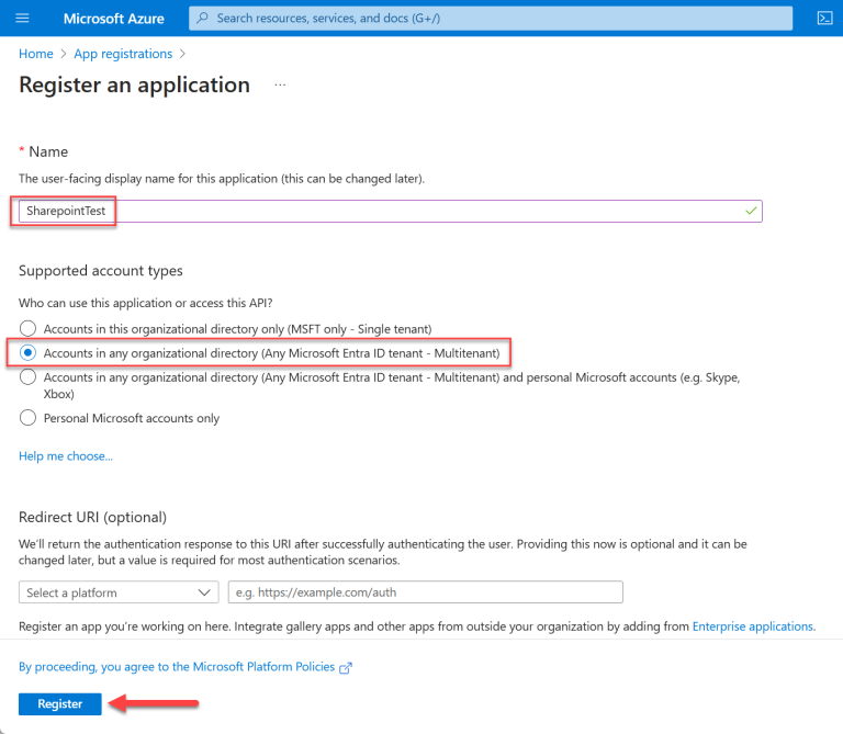 Enter the Name for the app, then select the second account type (Multitenant). Select Register.