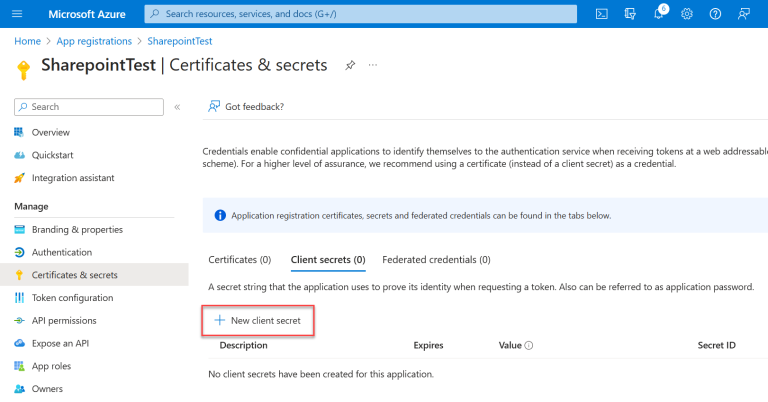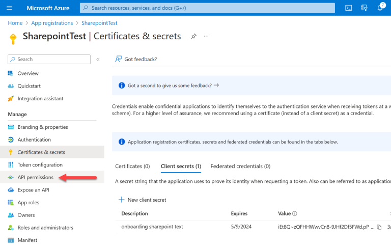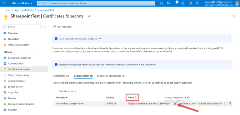 The values generated from the Azure App Registration section here are used as input to create the Secret under Azure Key Vault. This key vault is used by DSPM to connect to the Sharepoint, OneDrive or Teams application.