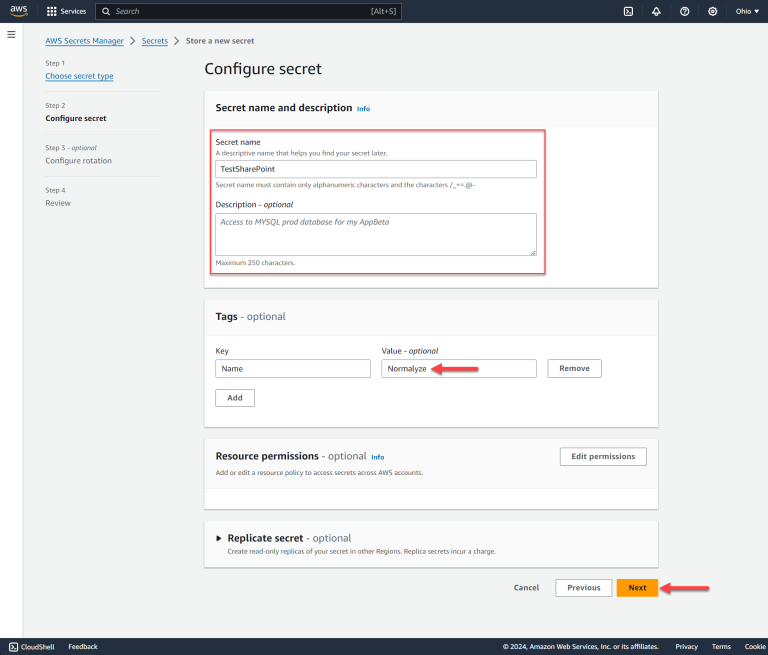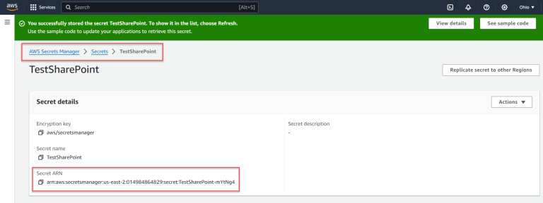 Select the Secret name in the screen that appears and copy the Secret ARN shown.
