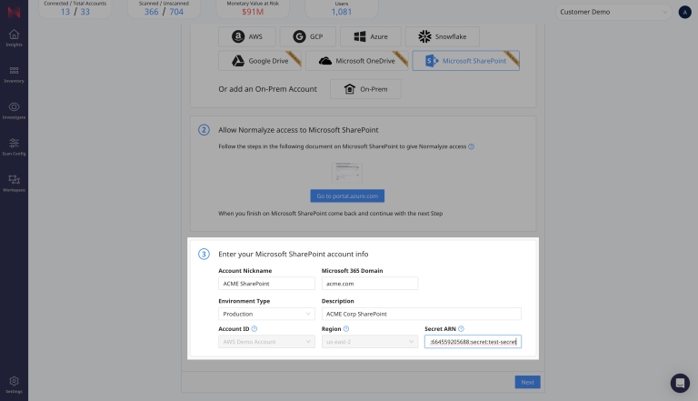Account Nickname - Provide an identifiable name for this account. This will be the name displayed on the DSPM UI for the Sharepoint account, OneDrive account or Teams account.