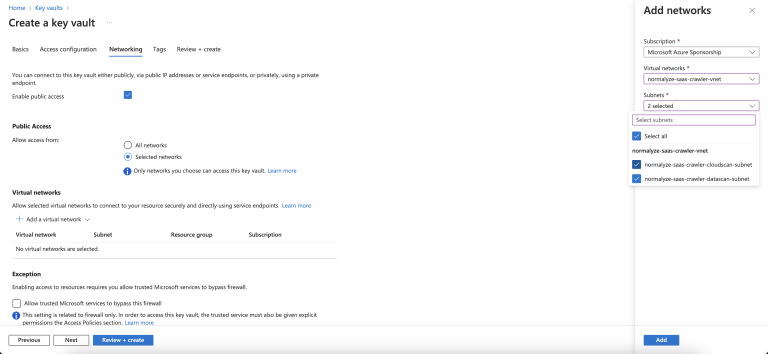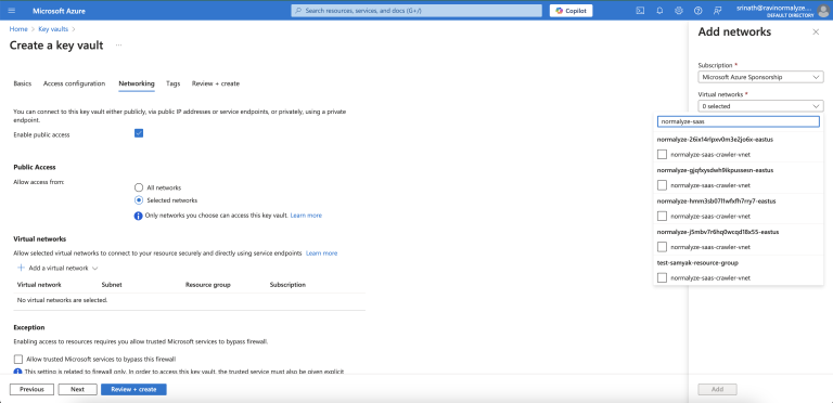- Select the VNET with name “normalyze-saas-crawler-vnet” which is shown under the resource group “normalyze-<onboarding-id>-<region>” pertaining to the DSPM account for which the configuration is being done.
