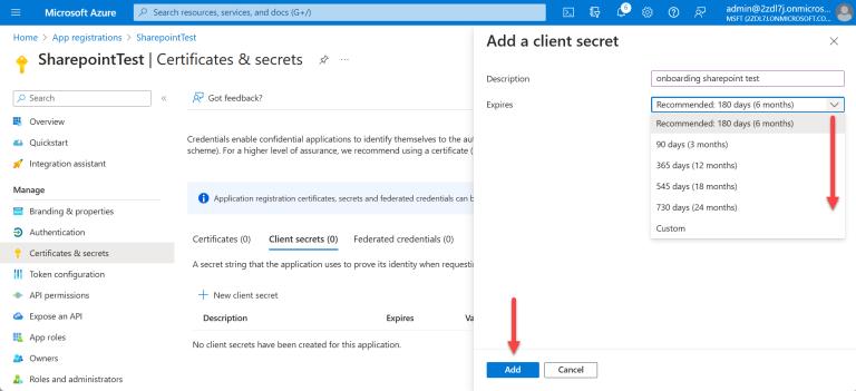 Enter a Description and select when the secret Expires from the dropdown options. Select Add.