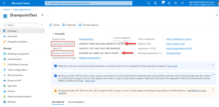 Copy and save the Application (client) ID and Directory (tenant) ID.