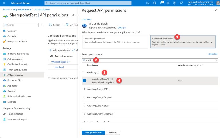 After selecting the checkbox for AuditLog.Read.All, enter the text for the next item in the search box to find the group it is in. You can select all the permissions listed above and then add them all at once.