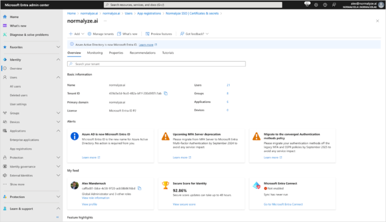 In the Microsoft Entra admin center, copy the Entra ID Domain and save it in a file. For details on viewing the domain, see https://entra.microsoft.com/#view/Microsoft_AAD_IAM/TenantOverview.ReactView.