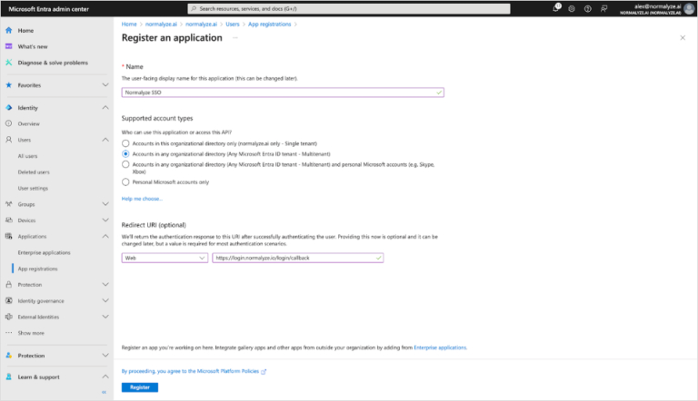 - Enter a name that describes the App registration purpose, such as “Proofpoint DSPM SSO”.