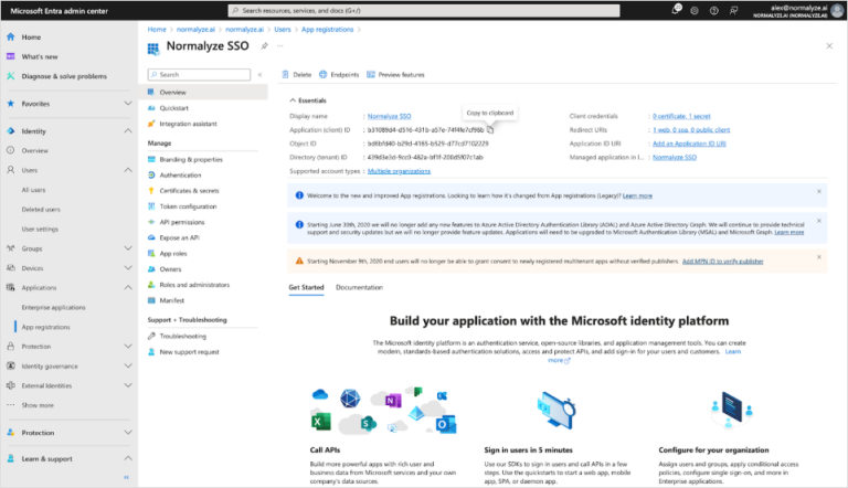 Go to the Overview page of the App Registration you just created. Copy the Application (client) ID and save it in a file.
