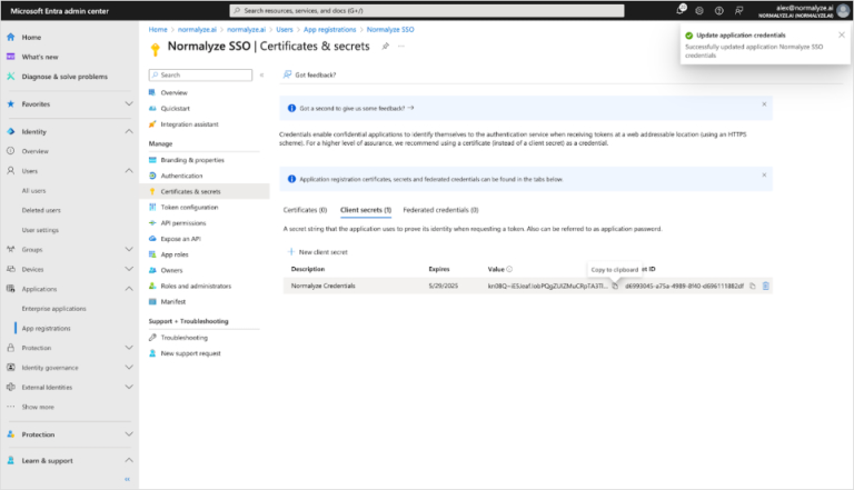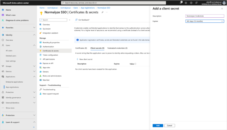 Go to the Certificates & secrets tab, select Client Secrets, and create a client secret. Give the secret an appropriate description and enter expiration criteria that matches your business policies.