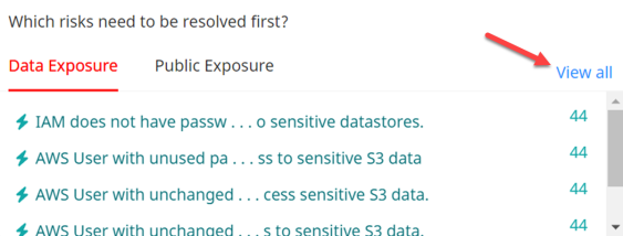From Data Exposure list, select View All which will display the entire list of entities that are determined to be publicly accessible with sensitive data.